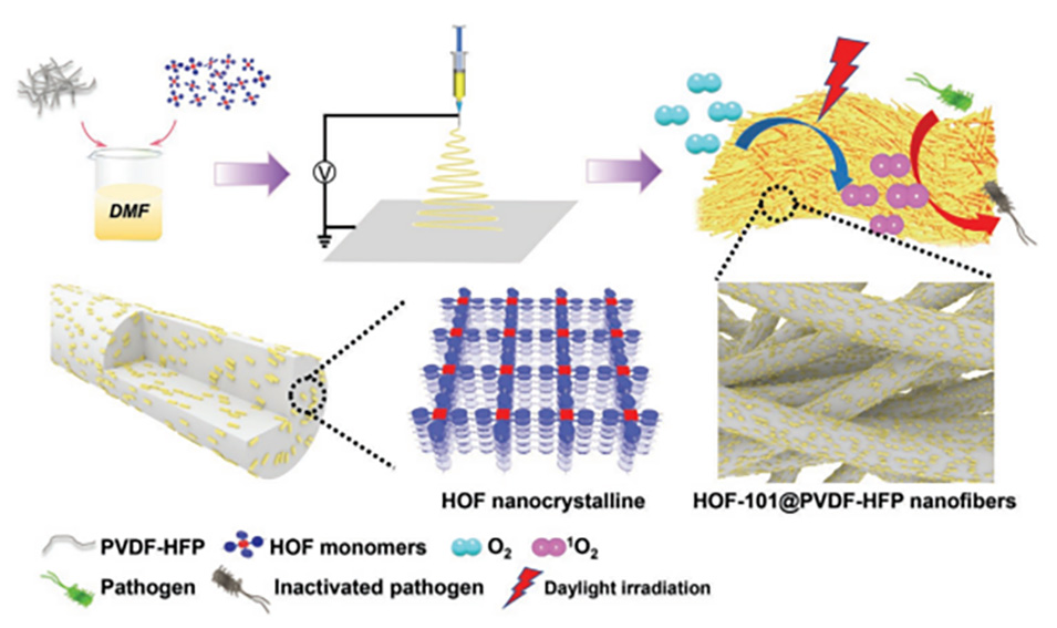 一旦发生公共卫生危机,将迫切需要高效且可持续的抗菌材料及设备。在此,本研究通过电纺丝将由光活性氢键有机框架(HOF)制成的长度约60nm的棒状纳米晶体嵌入广谱抗菌纳米纤维中。由此产生的HOF@PVDF-HFP纳米纤维保持了优异的拉伸和透气特性,同时保护HOF纳米晶体免受酸碱腐蚀。制备了一系列嵌入不同量和类型HOF纳米晶体的纳米纤维,以优化其单线态氧(1O2)生成效率。0.5wt%HOF-101-F@PVDF-HFP纳米纤维表现出最有效的1O2生成,与HOF-101-F微晶粉末相比,其生成效率提高了近2倍。研究证明,HOF@PVDF-HFP纳米纤维在环境光照条件下可于30分钟内高效杀死病原体,包括病毒、细菌和真菌。