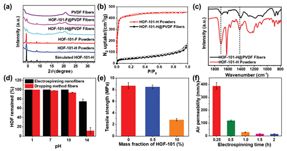 图3.a)HOF粉末和纳米纤维的PXRD图;b)HOF-101-H粉末(红色)在77K下的N2等温线和HOF-101-H@PVDF-HFP纳米纤维中HOF-101-H组分的归一化N2等温线(黑色);c)HOF-101-H粉末(红色)和HOF-101-H@PVDF-HFP纳米纤维(黑色)的FTIR光谱;d)酸性或碱性条件下,HOF在复合纤维中的保留;e)HOF-101-H@PVDF-HFP纳米纤维膜的拉伸强度和f)透气性。