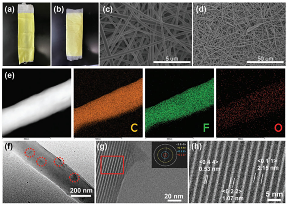 图2.HOF-101-H@PVDF-HFP纳米纤维在a)纱布和b)无纺布上的照片;c)PVDF-HFP纳米纤维和d)10wt%HOF-101-H@PVDF-HFP纳米纤维的SEM图像;e)10wt%HOF-101-H@PVDF-HFP纳米纤维的EDS图像;f)10wt%HOF-101-H@PVDF-HFP纳米纤维的TEM图像;g)纳米纤维上HOF-101-H的结构剖面以及所选区域的FFT图(插图);h)(g)中红色边框区域的放大结构。
