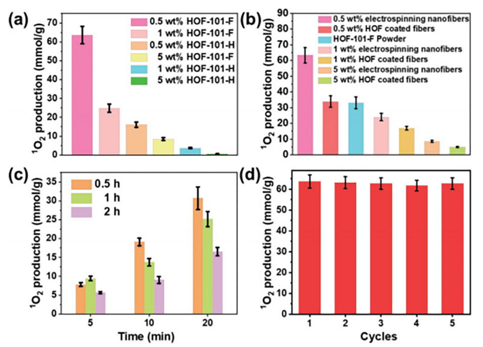 图4.a)不同质量分数的HOF@PVDF-HFP纳米纤维在20分钟内的1O2生成;b)HOF-101-F@PVDF-HFP静电纺丝纳米纤维、滴制法制备的HOF-101-F/PVDF-HFP纳米纤维和HOF-101-F微晶粉末在20分钟内的1O2生成;c)不同静电纺丝时间下1wt%HOF-101-F@PVDF-HFP纳米纤维的1O2生成;d)在520nm照射和黑暗处理下,0.5wt%HOF-101-F@PVDF-HFP电纺纳米纤维在20分钟内进行5次循环的1O2生成。
