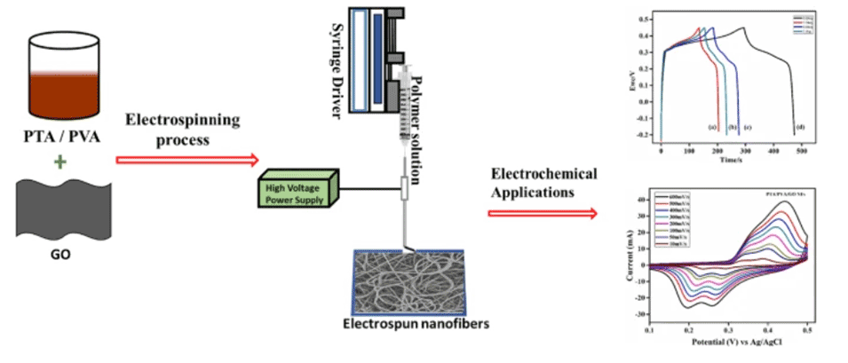 能源存储:石墨烯复合纳米纤维在超级电容器、锂离子电池和燃料电池等能源存储领域展现出潜在的应用价值,能够提高储能设备的性能和寿命。研究者通过电纺基聚硫代苯胺/聚乙烯醇/氧化石墨烯制备复合纳米纤维,用于超级电容器。
