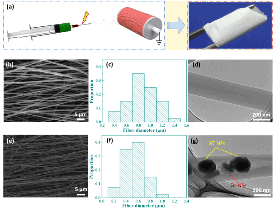 电子器件:石墨烯复合纳米纤维在柔性电子器件中的应用备受关注,例如柔性电子、可穿戴设备和柔性传感器,其高导电性和柔韧性使其成为理想的材料选择。比如石墨烯纳米片和BaTiO3纳米粒子协同作用增强柔性压电纳米发电机电纺PVDF纳米纤维毡的性能。
