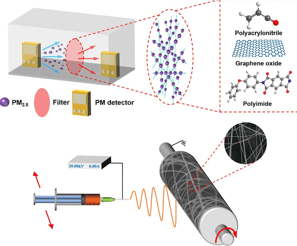纳米过滤材料: 由石墨烯复合纳米纤维构建的纳米过滤器具有高效的过滤性能,可用于水处理、空气净化和其他分离技术。比如,研究者利用静电纺聚丙烯腈/氧化石墨烯/聚酰亚胺纳米纤维膜,用于高效 PM 2.5过滤。