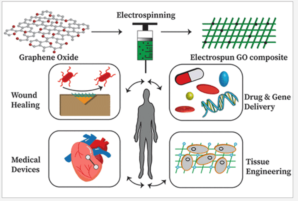 医疗应用: 石墨烯复合纳米纤维改善复合材料的细胞增殖、载药量和抗菌性能。因此,其在生物医学领域有广泛应用,包括药物传递、生物传感器和组织工程等方面。