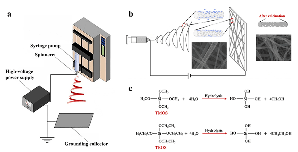 图2 (a)静电纺丝基本装置示意图。(a)制备静电纺SNF的一般工艺示意图。(c) TMOS和TEOS水解的主要反应。