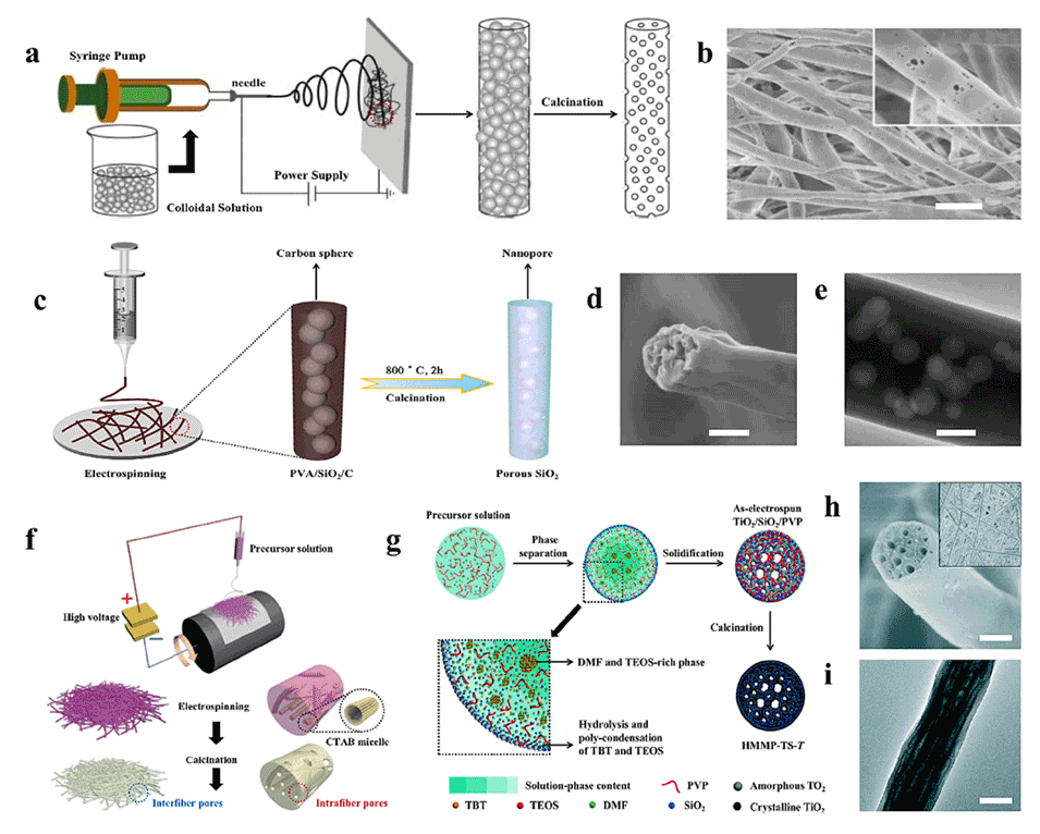 图3 (a和b) (a)胶体静电纺丝和煅烧过程示意图。(b)多孔SNFs的SEM图像。(c-e) (c)静电纺丝和煅烧制备多孔SNF的方案。(d)多孔SNFs的SEM图像。(e)多孔SNFs的透射电镜图像。(f) SiO2/TiO2复合多孔纳米纤维膜制备工艺示意图。(g-i) (g) HMMP-TS-T的形成过程示意图。(h)电纺丝PVP/TiO2/SiO2复合纤维的高倍率截面SEM图像和SEM图像(插图)。(i)静电纺丝PVP/TiO2/SiO2复合纤维的TEM图像。
