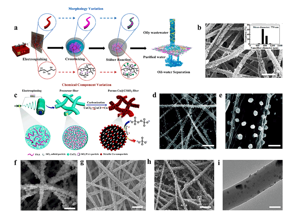 图4 (a)制备过程中形貌变化示意图,超疏油SiO2/PVA膜的制备过程,以及制备过程中化学成分的变化。(b)二氧化硅涂层PVA纳米纤维膜的SEM图像。(c) Cu@C/SiO2纳米纤维膜的设计、制备和氧化功能示意图。(d,e)逐渐增大放大倍数时Cu@C/SiO2纳米纤维的SEM图像。(f) SiO2@γ-AlOOH(薄水铝石)纳米纤维膜的SEM图像。(g)退火CuO-ZnO/SiO2膜的SEM图像。(h和i) (h) SiO2/CuO复合膜的SEM图像。(i)单个SiO2/CuO纳米纤维的TEM图像。