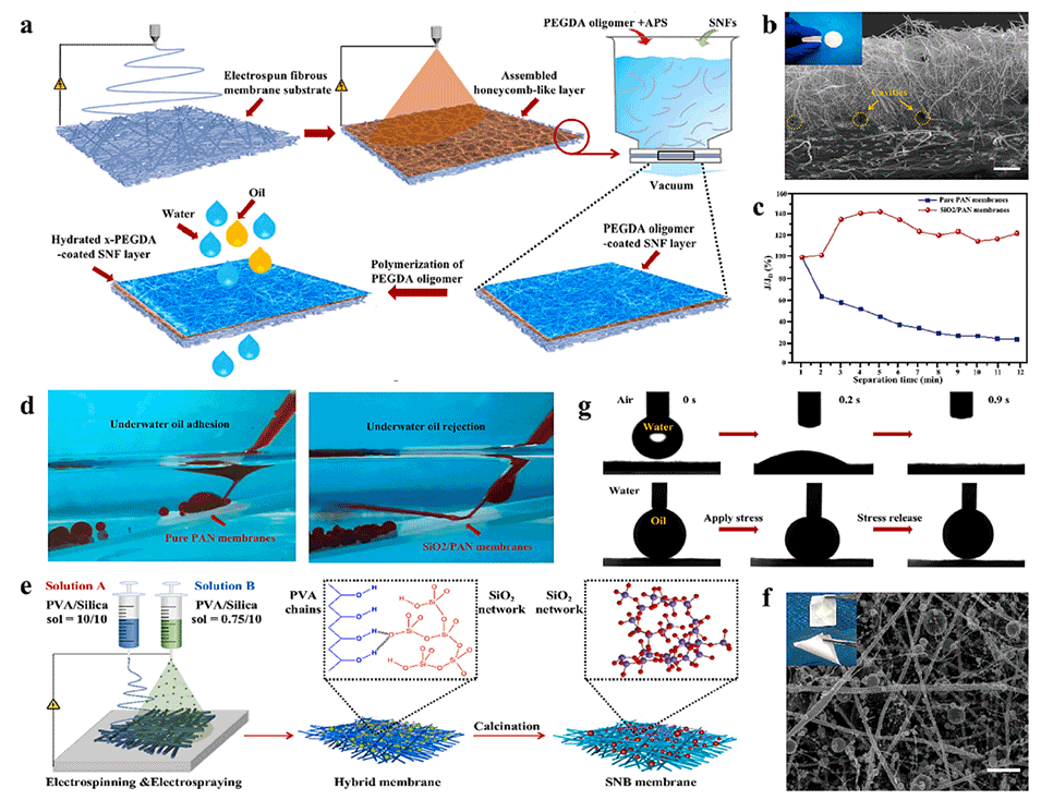 图6 (a)示意图显示了多层纳米纤维膜的制备途径。(b)SiO2/PAN复合膜横断面扫描电镜图像。(c)纯PAN膜和所选SiO2/PAN膜对无表面活性剂的水包油乳液的渗透通量变化率。(d)照片分别展示了油在纯PAN膜和相关SiO2/PAN膜表面的粘附和排斥行为。(f) SNB复合膜的SEM图像。插图是展示SNB膜柔韧性的光学照片。(g)水在空气中的动态润湿过程(上)及水下油在SNB膜表面的附着特性。