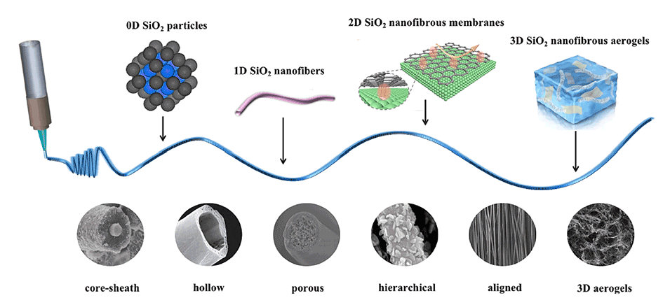 图7 静电纺丝SNFs的研究进展,从零向三维发展。SNFs的结构逐渐发展为芯鞘、中空、多孔、分层、排列和三维气凝胶。