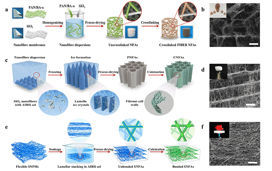 图5 (a和b) (a)合成步骤示意图。(b) SiO2纳米纤维气凝胶的SEM图像,显示了分层的细胞纤维结构。(c及d) (c)二氧化硅纳米纤维气凝胶的制备示意图。(d) SiO2纳米纤维气凝胶的SEM图像,显示了分层的纳米纤维细胞结构。(e)二氧化硅纳米纤维气凝胶制备途径示意图。(f) SiO2纳米纤维气凝胶的SEM图像,显示出多拱形层状结构。