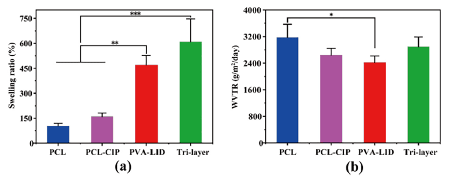 3、TNM将水接触角从10°(内层)显着提高到120°(外层),表现出不对称的润湿性,可以在材料内定向输送伤口渗出液,同时保持舒适湿润的环境,促进伤口愈合。