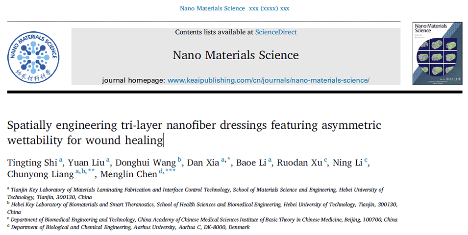 近期,河北工业大学夏丹副教授等人制备了一种具有非对称润湿性的三层纳米纤维膜,以促进伤口愈合。该膜具有亲水的内层装载盐酸利多卡因,疏水的中间层装载环丙沙星,疏水的外层具有防水和抗粘附性能。相关研究成果以“Spatially engineering tri-layer nanofiber dressings featuring asymmetric wettability for wound healing”为题目,发表于期刊《Nano Materials Science》上。