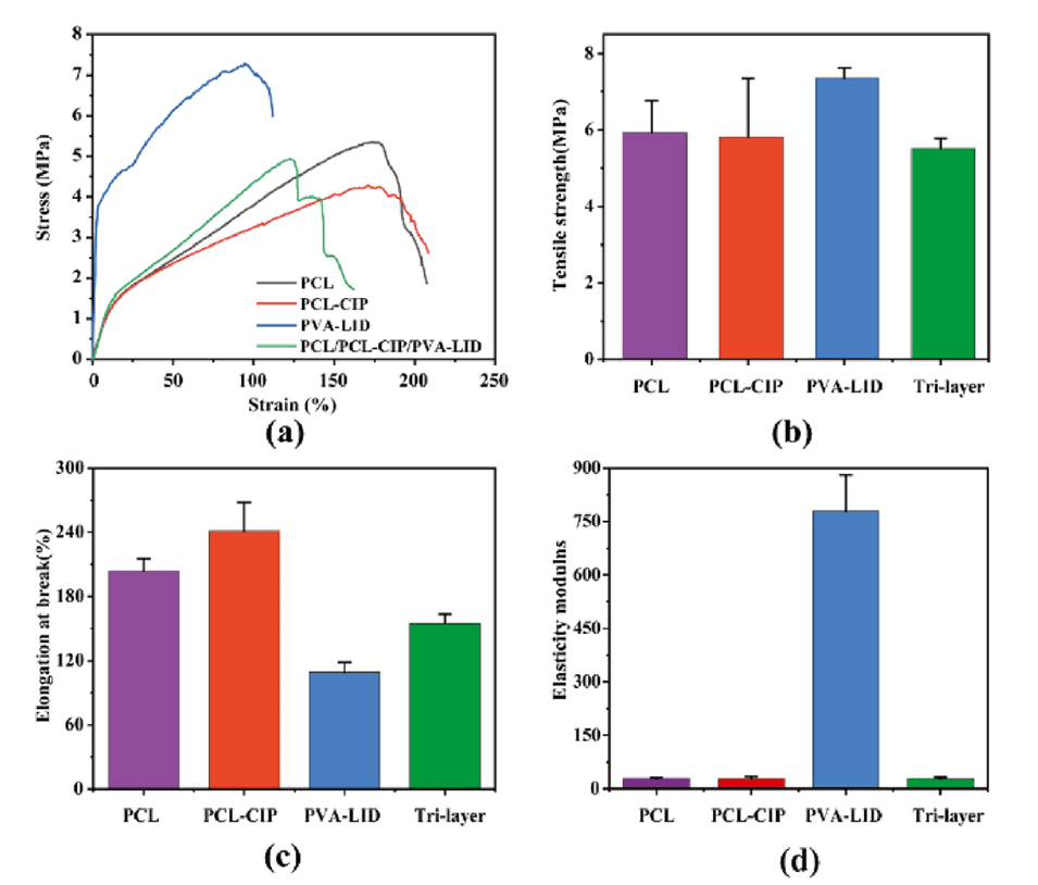 图2 (a)应力-应变曲线,(b)抗拉强度,(c)断裂伸长率,(d)不同纳米纤维膜的弹性模量。