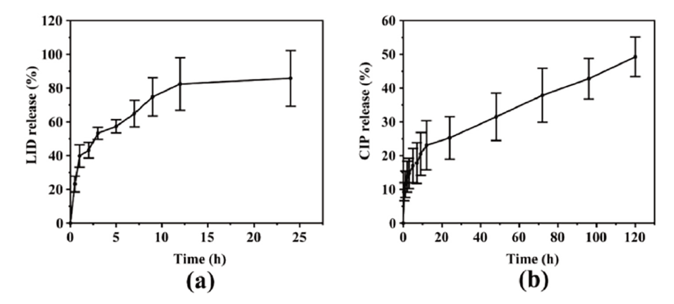 图5 TNM的体外药物释放。(a) LID;(b) CIP。