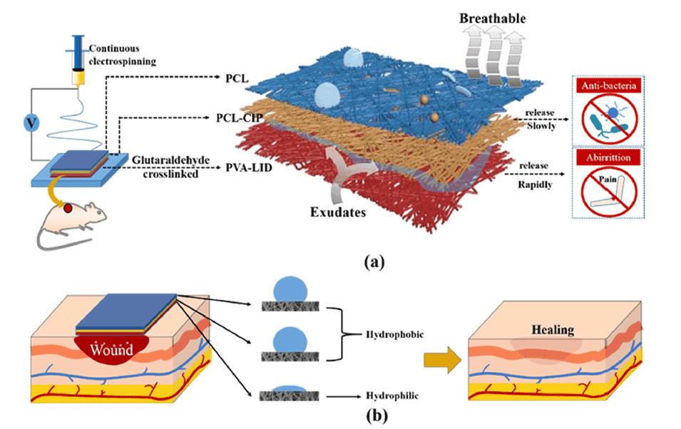 Scheme 1:TNM的制备示意图。a)顺序静电纺丝制备的具有非对称润湿性的TNM可避免细菌感染,并可使LID和CIP以不同的释放速率释放,加速创面愈合;(b)应用于创面部位的TNM模型及分离层润湿性图。