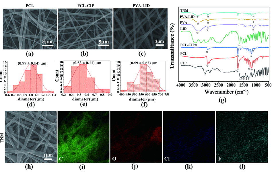 图1 (a-c) PCL、PCL- CIP和PVA-LID纤维的SEM图像和(d-f)相应的直径分布;(g) CIP、LID药物及不同纤维膜的FTIR光谱;(h - 1) TNM纤维的SEM图和EDS图。