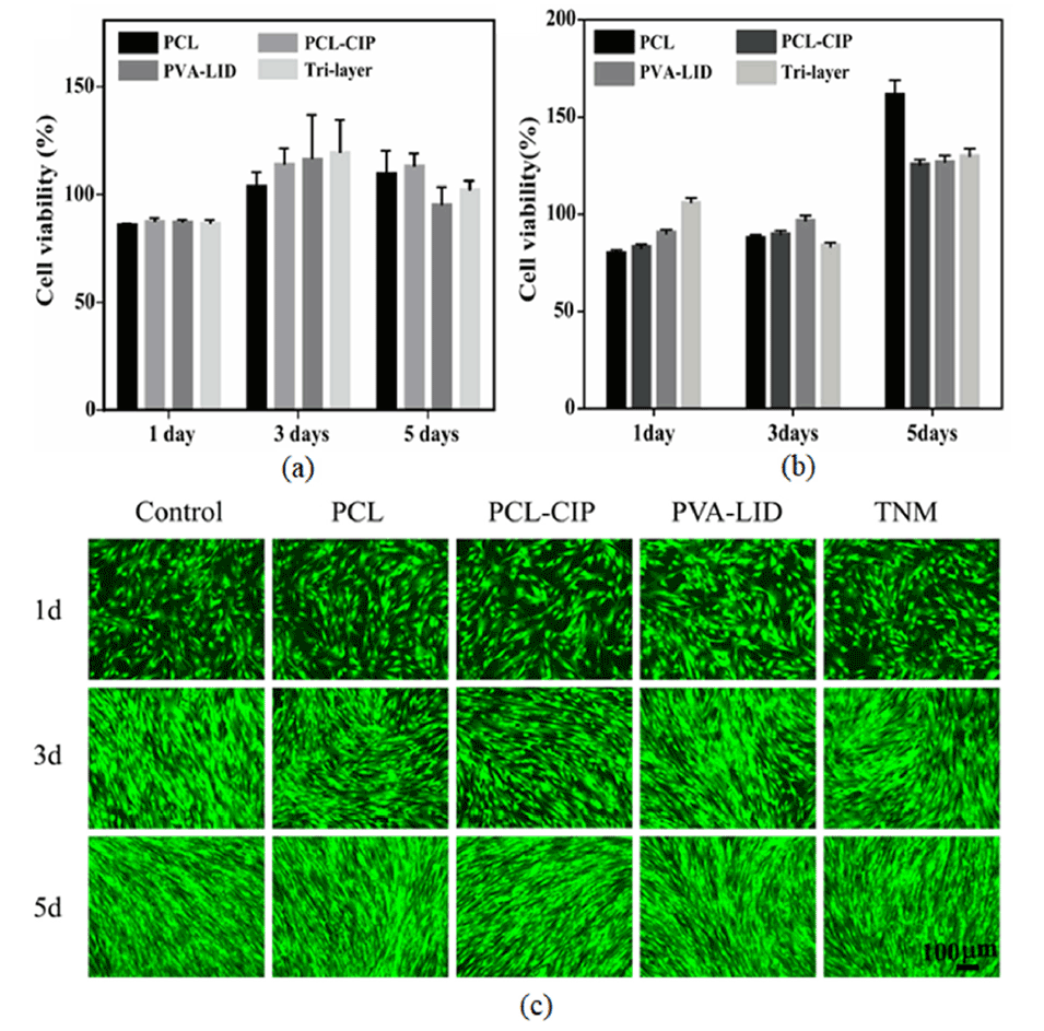 图7 不同纳米纤维膜对(a) L929细胞和(b)成纤维细胞的细胞毒性;(c)成纤维细胞1、3、5天的荧光成像。