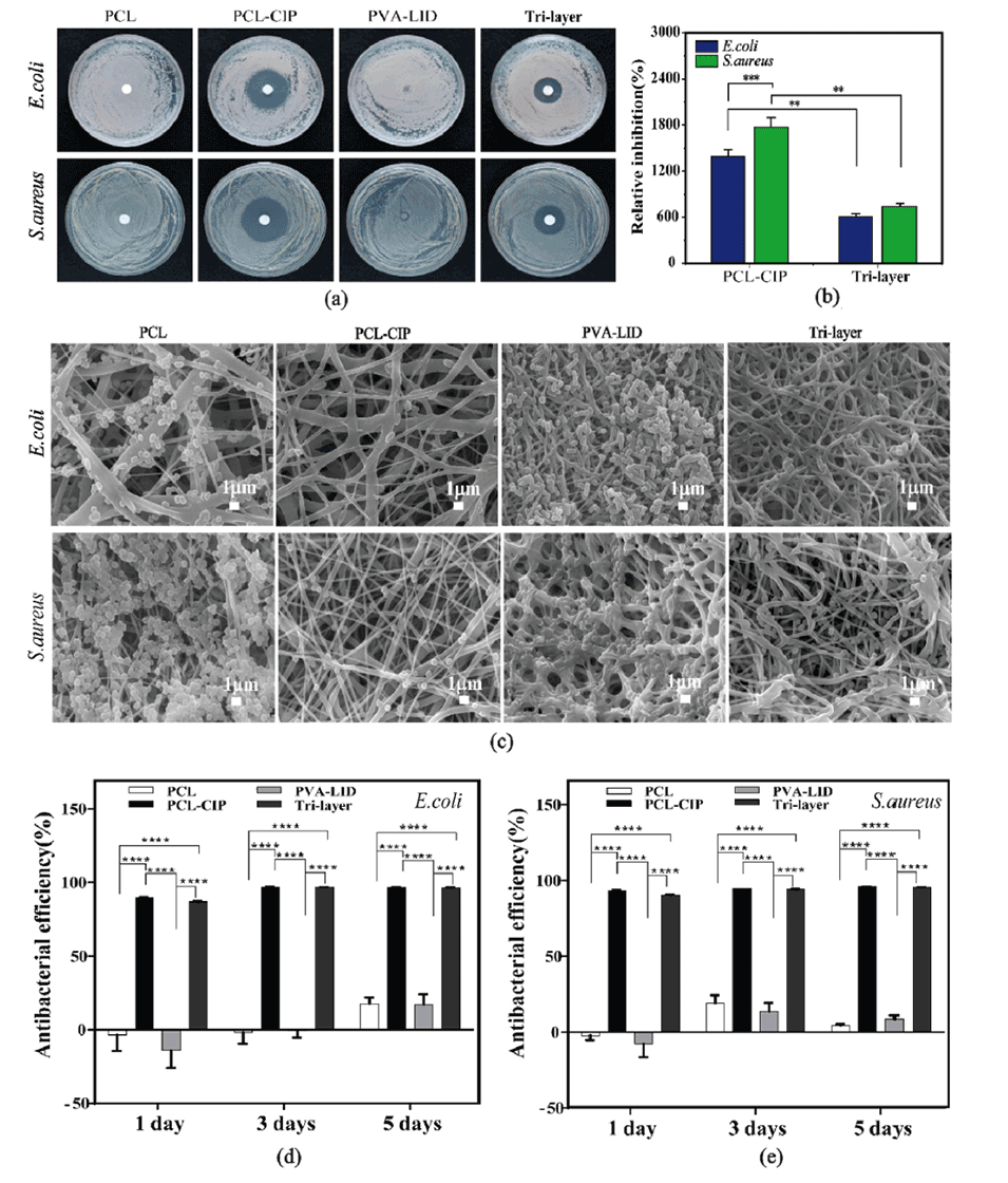1、受皮肤结构启发,该研究开发了一种具有不对称润湿性的三层纳米纤维膜(TNM),包括载有盐酸利多卡因(LID)的亲水内层、载有环丙沙星(CIP)的疏水中间层和疏水外层。
