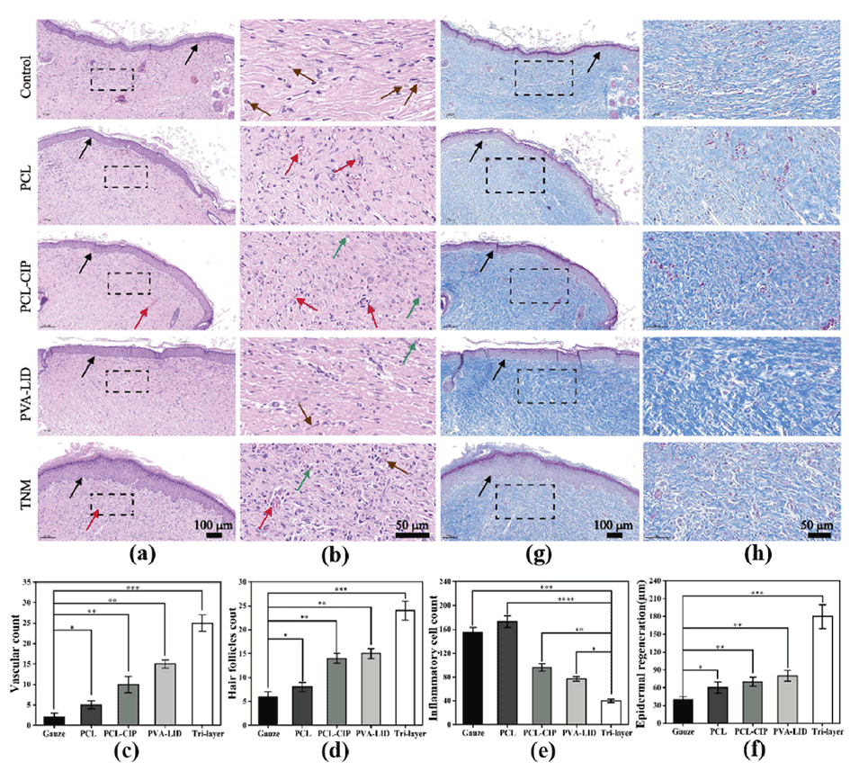 4、LID和CIP的顺序释放可以分别快速缓解疼痛并实现长期抗菌效果。此外,TNM 对 L929 细胞表现出优异的生物相容性。TNM可以预防感染、加速上皮再生并显着加速伤口愈合。