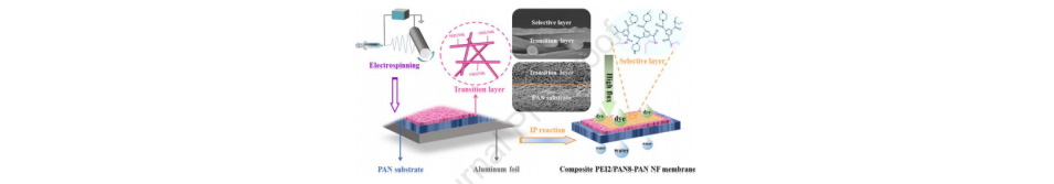 聚乙烯亚胺(PEI)/聚丙烯腈(PAN)过渡层和PAN基底层均是通过静电纺丝制备而成的,随后用均苯三甲酰氯和哌嗪进行界面聚合(IP)。PEI改性过渡层的引入提高了亲水性,为IP提供了额外的反应位点,并避免了纳米纤维孔内的聚合。所得复合NF膜具有致密且无缺陷的选择层。这样的最佳结构带来了出色的分离性能,橙黄II染料(MW=350.32g/mol)的截留率为95.6%,纯水通量为38.5 L m-2 h-1 bar-1。