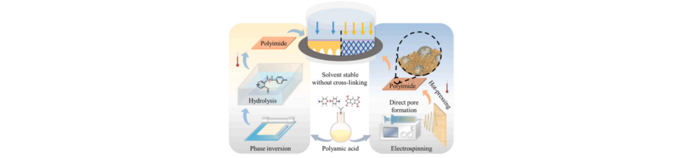 本文首次提出了一种采用静电纺丝聚酰胺酸和热亚胺化相结合的方法来制备不溶性聚酰亚胺纳米纤维基底的策略。与常规的相转化工艺相比,无水静电纺丝工艺可使基材的机械强度提高1倍,耐溶剂性也有所提高。与最新型膜相比,所制备的薄膜纳米纤维复合膜(TFNC)在水和极性非质子溶剂(如二甲基甲酰胺、二甲基亚砜和四氢呋喃)中具有较高的渗透性、截留性和稳定性,显示出独特的纳滤潜力。